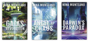 By 2095 (Book 2, Angel of Chaos and Book 3, Darwin’s Paradox), humanity—now under Gaian rule—has fled inside environmental dome cities called Icarias, chased inside by an unruly environment. Icarians struggle with Darwin’s Disease—a mysterious neurological environmental pandemic. Icaria 5 (formerly Toronto, Canada) is one of many enclosed cities within the slowly recovering toxic wasteland of North America, and where the protagonist Julie Crane (daughter of one of the orphans in Gaia’s Revolution and a veemeld) lives and works. Julie must deal with the ghosts of the characters in Book 1: including her dead and discredited father, now implicated in spreading subversive science and charged with several political assassinations.