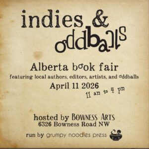 This weekend, I’ll be at the Indies and Oddballs Alberta Book Fair, hosted by Bowness Arts at 6326 Bowness Road NW in Calgary.